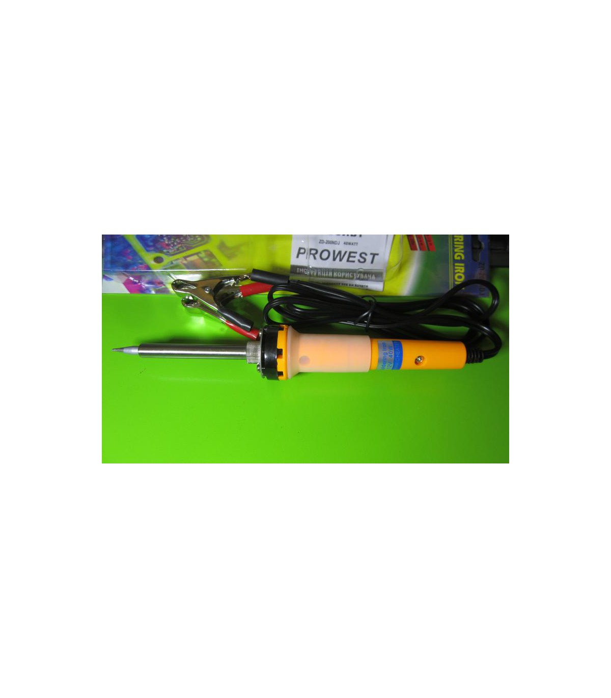 Паяльник ZD-200NDJ 40W - паяльник с зажимами типа 'крокодил' вместо стандартной вилки. Мощность паяльника 40 Вт. Оснащен керамическим нагревательным элементом.