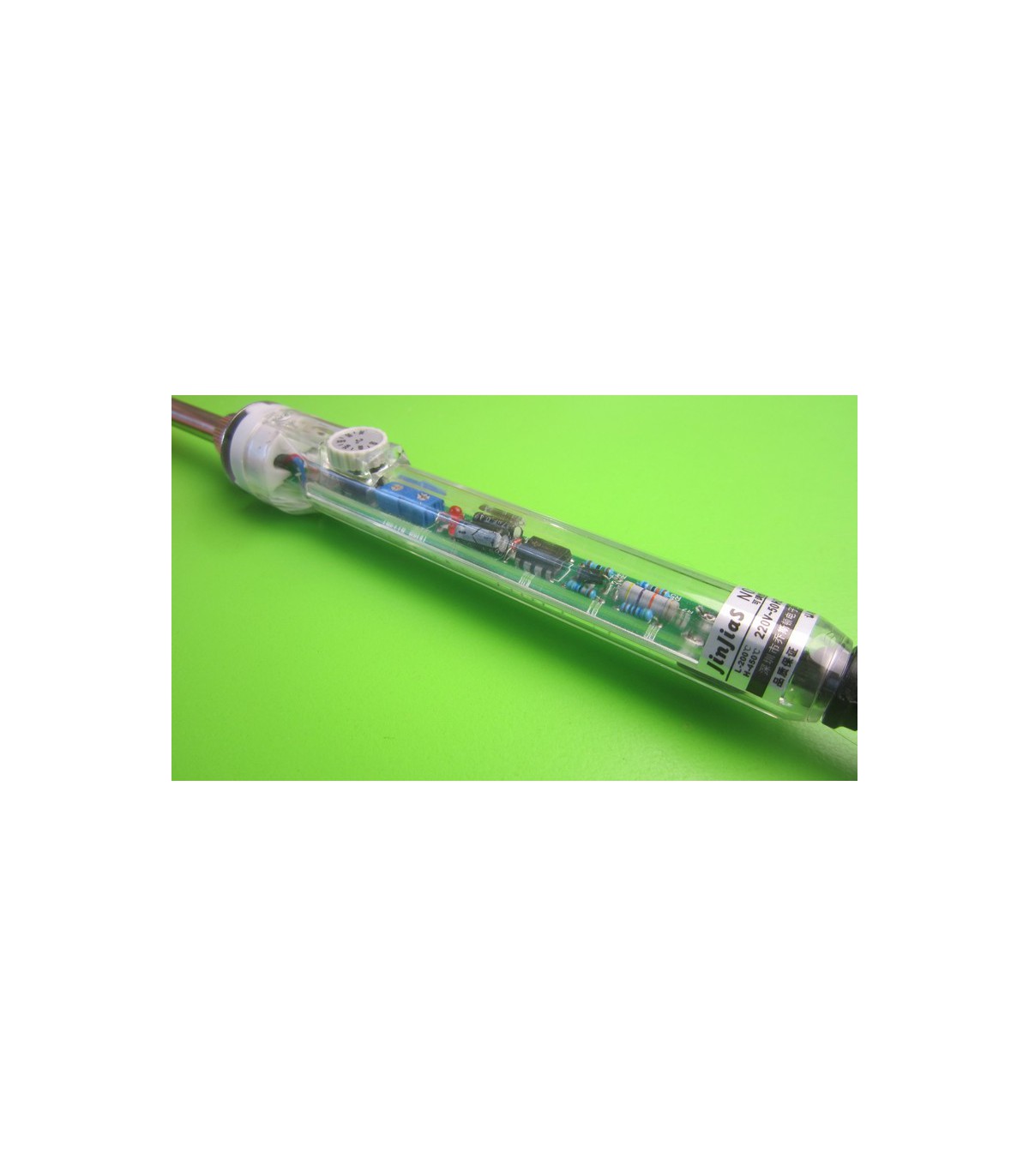 Паяльник 60 Вт с регулировкой температуры 907 (GJ907). Жало паяльника при необходимости можно заземлить. Т.к. развязки с сетевым напряжением нет и от наводок можно убить при пайке полевые транзисторы, микросхемы и другие чувствительные элементы. Для заземления, из паяльника выходит провод с зажимом. Вилка питания - китайская, в комплекте переходник. Паяльник снабжен регулятором температуры, которая регулируется в пределах от 200 до 450 °C. Если горит светодиод - то паяльник в процессе нагрева. После того, как набрана нужная температура - светодиод гаснет. Судя по схеме здесь используется именно обратная связь по термопаре, а не просто регулировка мощности, что является несомненным плюсом недорогого паяльника. Жало у паяльника съемное, необгораемое. Жало не совместимо с 900-ми. Они разные и по длине и по диаметру. От нагревателя выходит 4 провода: два провода для термодатчика и два провода для нагревательного элемента. С одной стороны наличие термодатчика это плюс, но с другой стороны что он расположен в самом нагревателе - это минус, т.к. будет инерционность и задержка срабатывания включения нагрева. Сопротивление нагревательного элемента 890 Ом (два белых провода). Сопротивление термодатчика при комнатной температуре (красный и синий провод): ~4 Ом. Напряжение на нагревательном элементе 220В. Плата управления. Операционник IC2: HA17358 (LM358). Для управления нагревательным элементом служит симистор MAC97A8. В этом паяльнике присутствует два подстроечника VT1 и VT2. Один задает верхний диапазон температуры, второй нижний. Как видно из схемы, никаких дефицитных деталей нет, SMD также не используется и в случае выхода из строя можно заменить перегоревшую деталь. Вообще, в плане ремонтнопригодности паяльник тоже достаточно хорош, т.к. и в плате можно что-то заменить, и сам нагреватель и жала свободно продаются. Технические характеристики Мощность: 60Вт Температура: 200...450°C Входное напряжение: 220...240В Сопротивление изоляции: 100MΩ Длина: 240мм * поставляется паяльник в прозрачной упаковке.