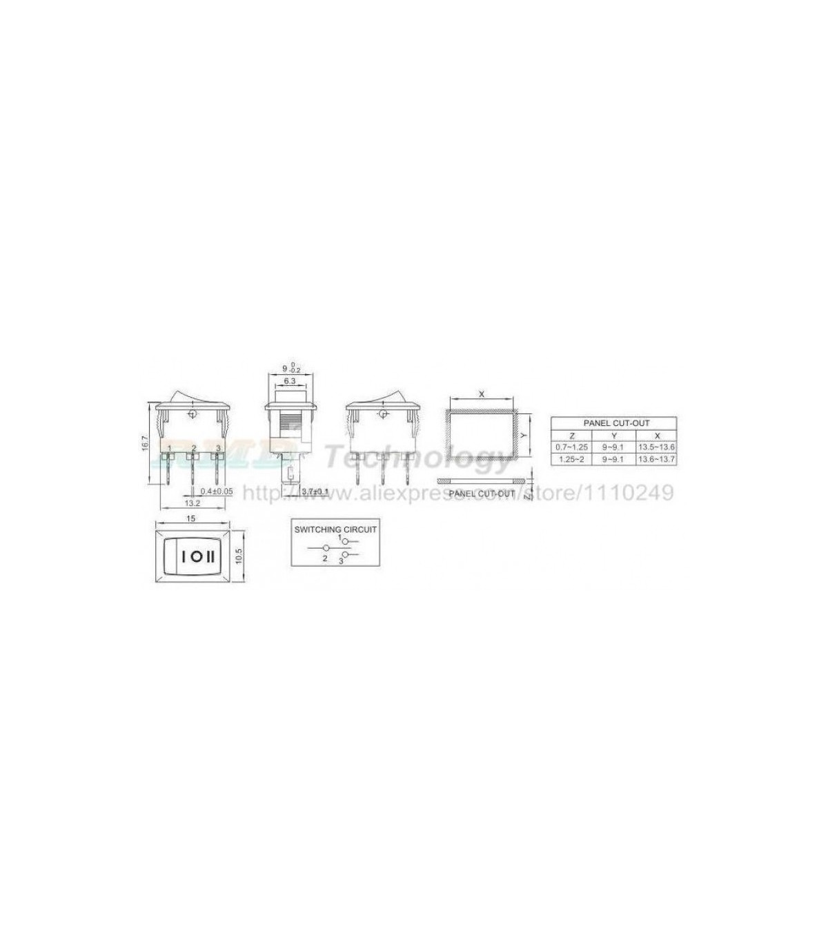 Переключатель три позиции KCD11 10*15мм 3A 250V три контакта.
