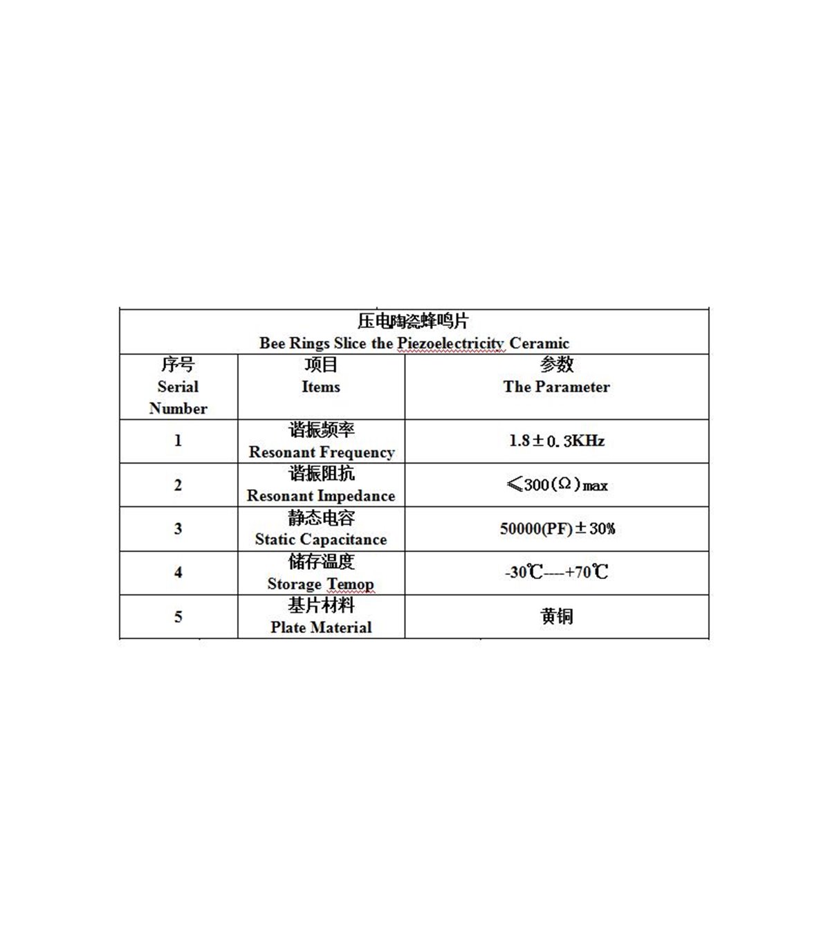Резонансная частота: 1.8+-0.3kHz Резонансный импеданс: <,300Om Статическая емкость: 50000Pf+-30% Температура хранения: -30...70С Материал: латунь