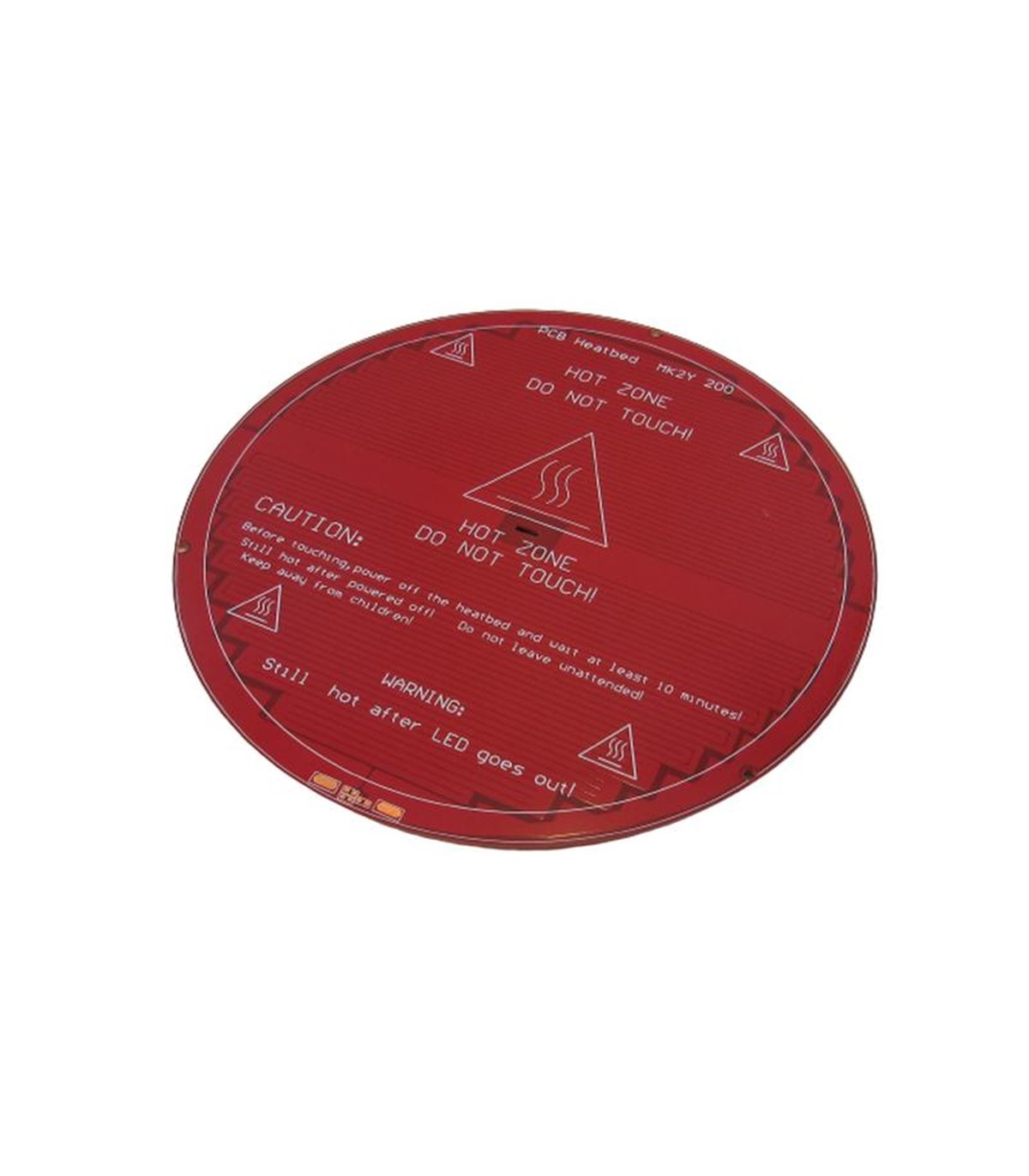 Круглая алюминиевая нагревательная платформа МК3 3D-принтера.Нагревательная платформа MK3 используется в 3D-принтерах для подогрева моделей при печати. Платформа представляет из себя целый лист алюминия толщиной 3 мм, ламинированного с нижней стороны, под которым находится слой медной нагревательной поверхности толщиной 35 мкм. Платформа имеет 6 монтажных отверстий, медные контакты для припайки кабелей питания, светодиодных индикаторов.