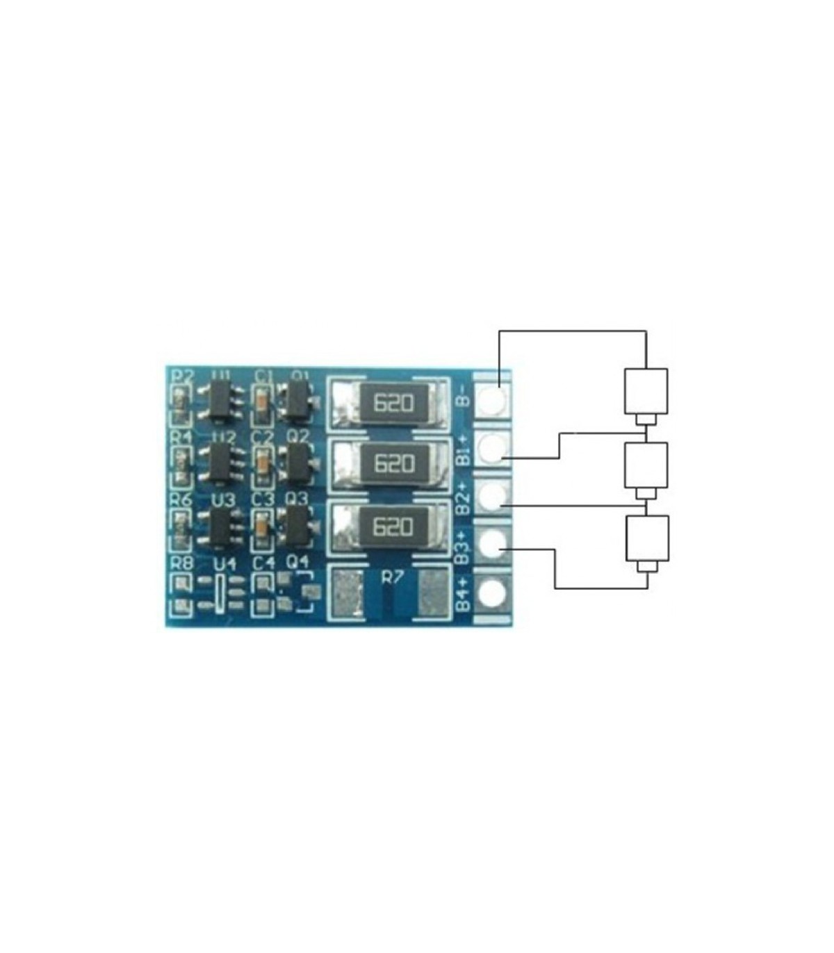 Плата балансування для 4 акумуляторів підходить для незбалансованої зарядки літій-іонних батарей, для вирівнювання заряду. Струм балансування - 66 мА. Схема підключення зображена на фото.