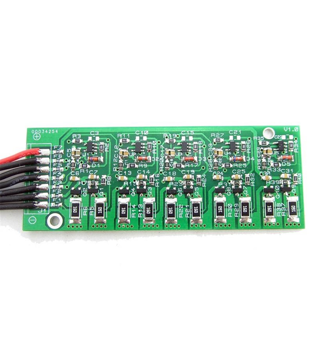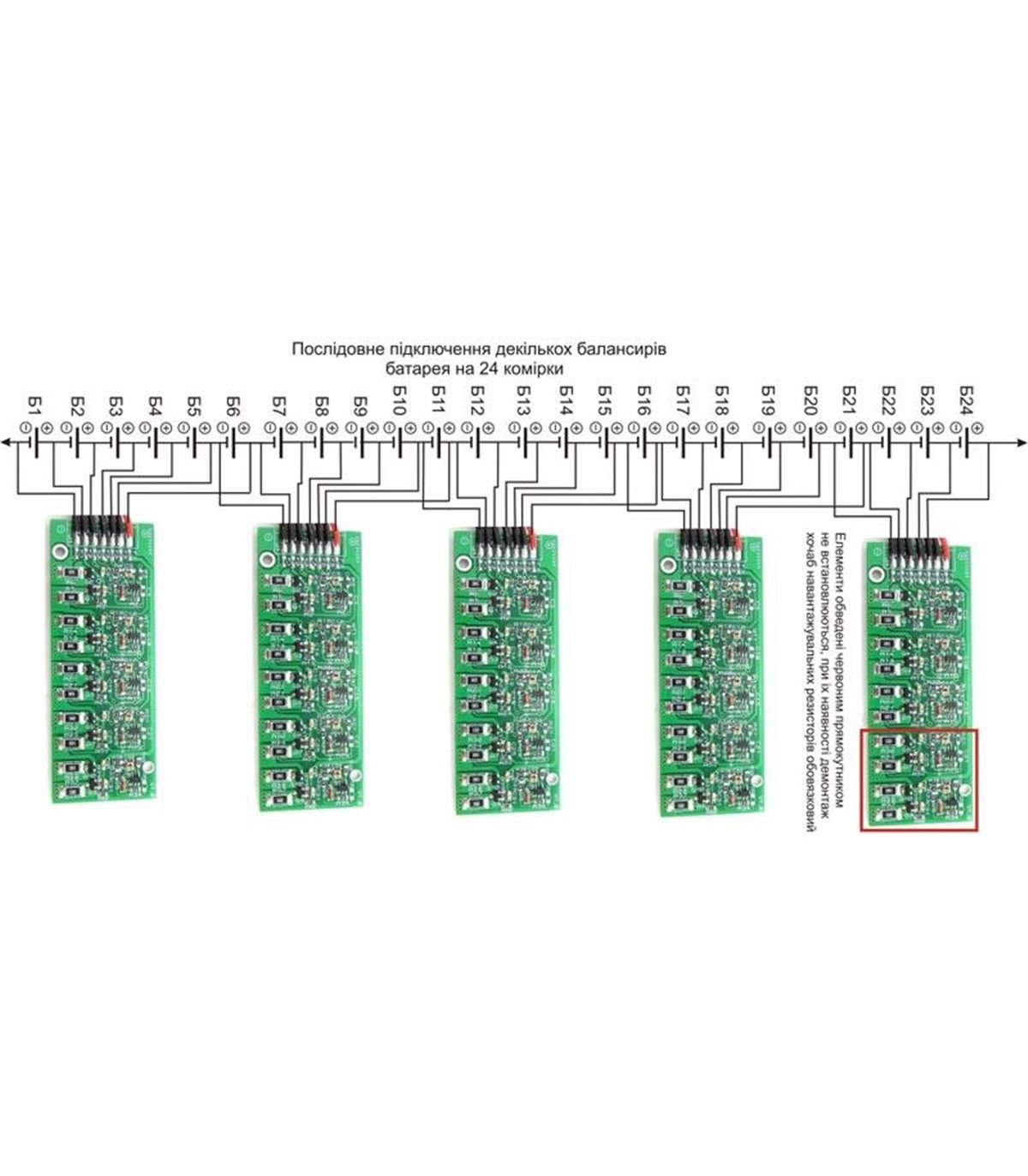 Использование в сборниках элементов отличных от шести последовательно. Возможно использование балансиров для балансировки меньшей или большей чем 6 числа последовательно соединенных элементов. Так как элементы сравниваются попарно то балансир на 6 ячеек содержит 5 микросхем сравнения, для балансировки n ячеек, нужно n-1 микросхем сравнения. Для балансировки батареи с меньшим количеством ячеек например 4 нужно оставить 3 микросхемы сравнения другие 2 не устанавливаются вместе с соответствующими погрузочными резисторами. Более подробная схема подключения будет в пакете вместе с купленным балансиром.
