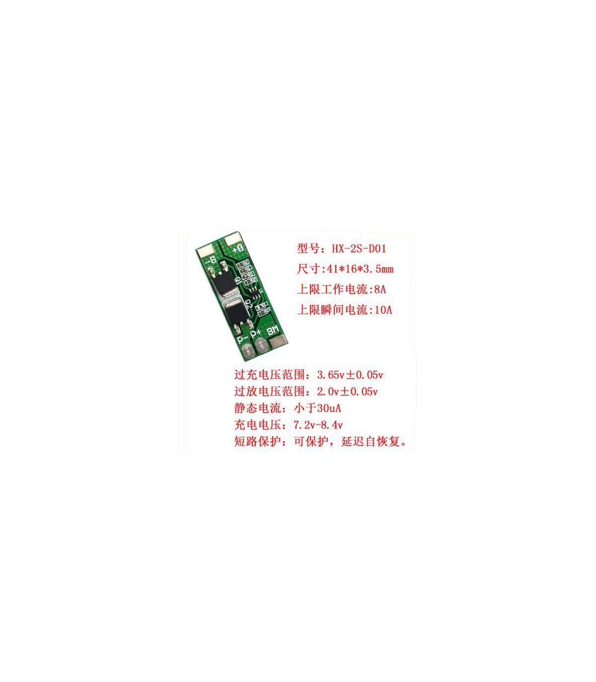 Технические характеристики Напряжение выявления перезарядки:3,65В Задержка защиты от перезарядки: 2,0В Верхний предел непрерывного тока:8A Максимальный верхний ток: 10A Напряжение зарядки: 7,2-8,4В Ток покоя: менее 30uA Размер изделия: 41*16*3,5 мм