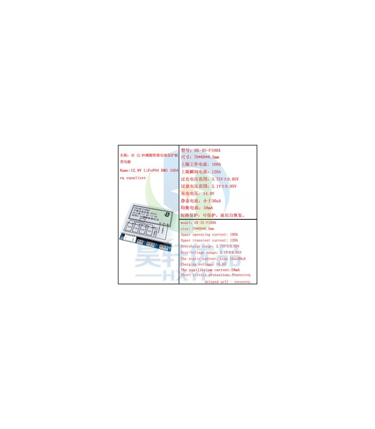 Плата BMS HXYP-4S-B100A-3.2V предназначена для защиты и управления 4-секционными LiFePO₄ аккумуляторами (12.8–14.4 V). Обеспечивает контроль заряда и разряда, балансировку ячеек и защиту батареи от перезаряда, глубокого разряда, перегрузки по току и перегрева. Подходит для использования в инверторных системах, солнечных установках, электротранспорте и DIY-аккумуляторных сборках.