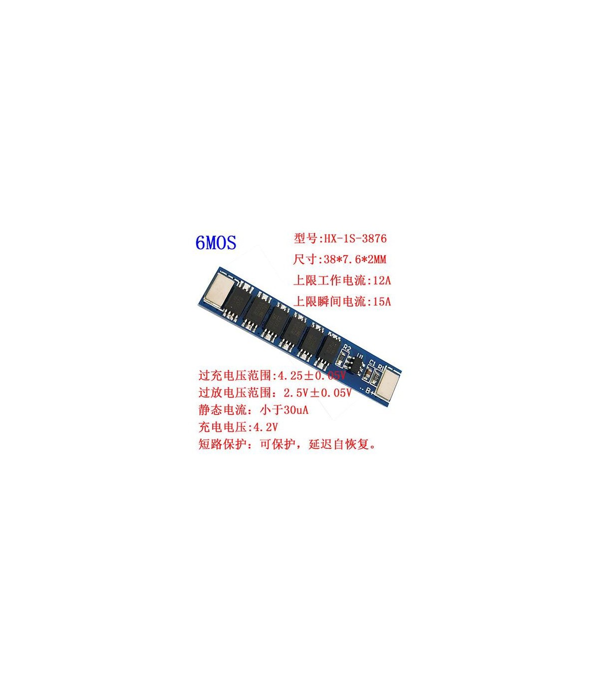 Применение: для 1 литий-ионного аккумулятора Номинальное напряжение: 3.7V Напряжение полного заряда: 4.2В Максимальное напряжение заряда на элементе: 4.250 ± 0.025 В Минимальное напряжение заряда на элементе 2.5 ± 0.05 В Максимальный непрерывный ток заряда 2 A Номинальный ток разряда: 12 А Максимальный ток разряда: 15 А Диапазон рабочих температур: - 40 ~ + 85 ℃ Размер: 40х8х2 мм