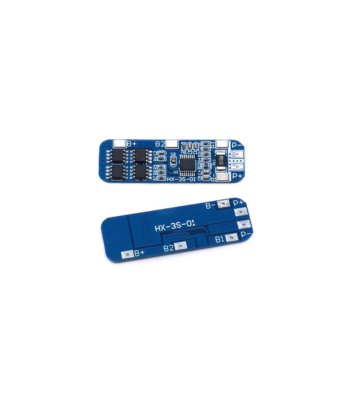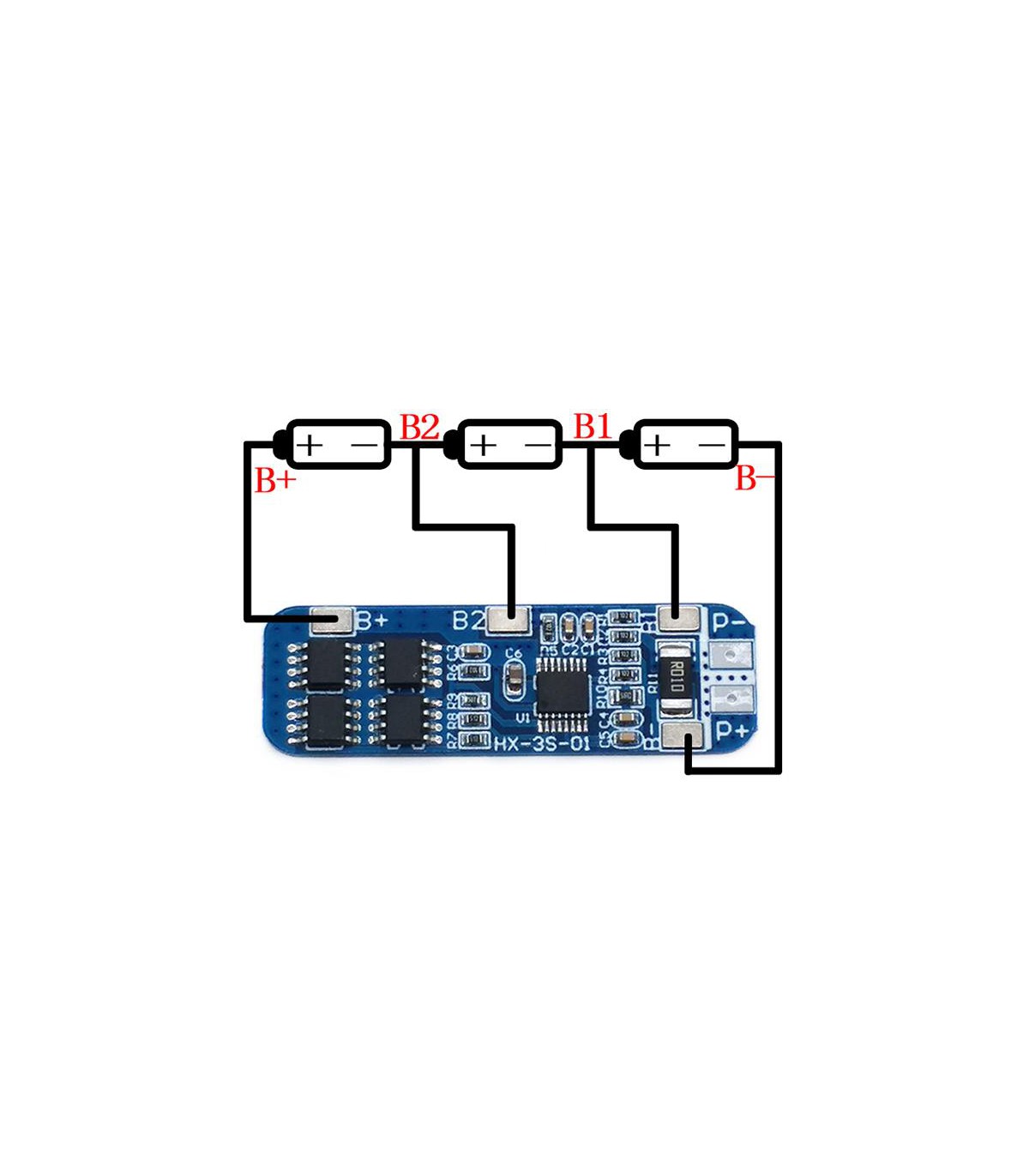 Контролер заряду розряду 3х Li-Ion 18650 12.6V 10A HX-3S-01. Технічні характеристики Максимальний струм розряду: 10 А Максимальна напруга при зарядці: 4.25 В ± 0.025 В Перевантаження напруги: 4,35 ± 0,05 В Мінімальна напруга при розрядці: 2.75 В ± 0. 1 В Діапазон напруг на виході: 8.25-12.6 В Розмір: 50х16 мм Функції: захист від перезарядження, захист від перевантаження, захист від короткого замикання Підключення B +, B- пов'язано з акуммулятор (акуммулятор паралельно спаяними) 18650 P +, P- пов'язано з джерелом заряду і розряду