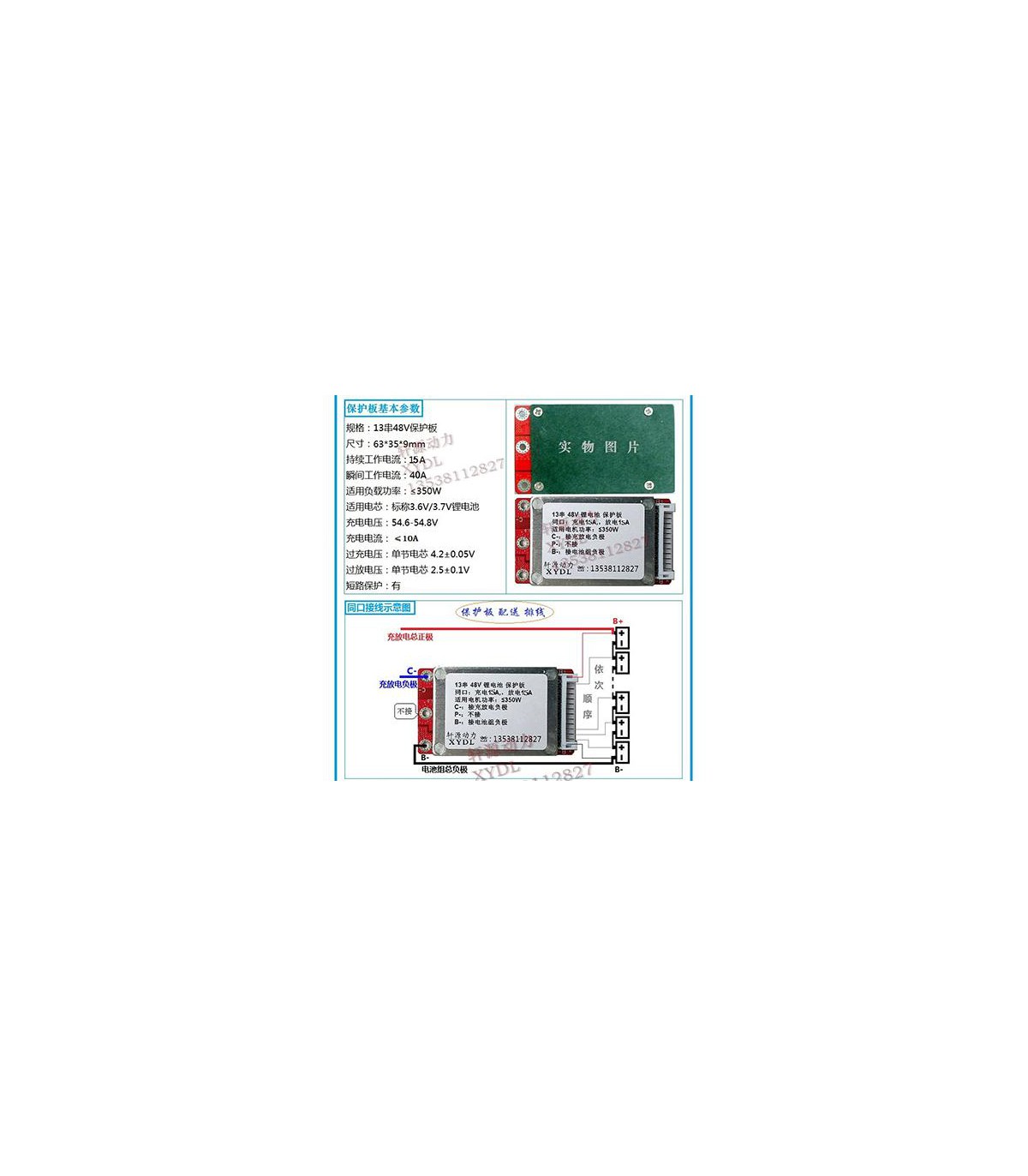 Плата защиты аккумулятора Li-Ion BMS 13S 48V 15A (16407)