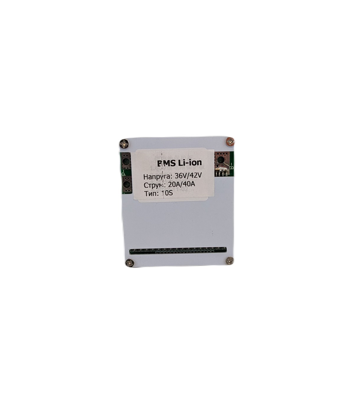 Тип: Li-Ion 10S Максимальный ток разряда: 40 A Номинальное напряжение одного элемента: 3,7 V Максимальное напряжение заряда одного элемента: 4,3 V Минимальное напряжение разряда одного элемента: 2,4-3,0 V Напряжение начала балансировки: 4,18 V Ток балансировки: 30 mA Внутреннее сопротивление: 20 mO Ток потребления: 20-40 mA