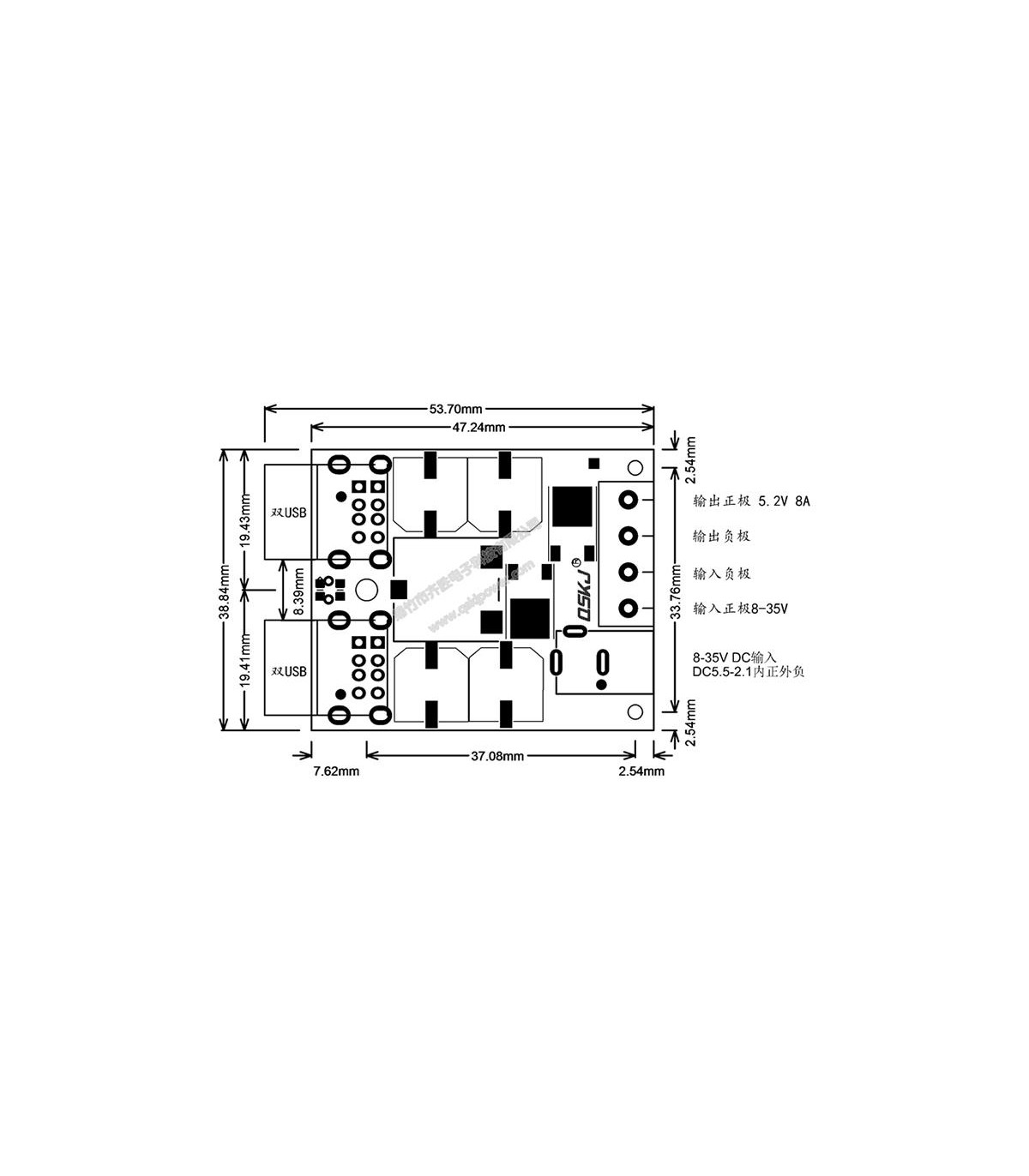 Снижающий преобразователь USB 8-35V to 5V 8A солнечная зарядка.Технические характеристикиВходное напряжение: 8-35 ВВыходное напряжение: 5 ВВыходной ток: 8 А (общий)Эффективность: 90-97 %4 х USB выход