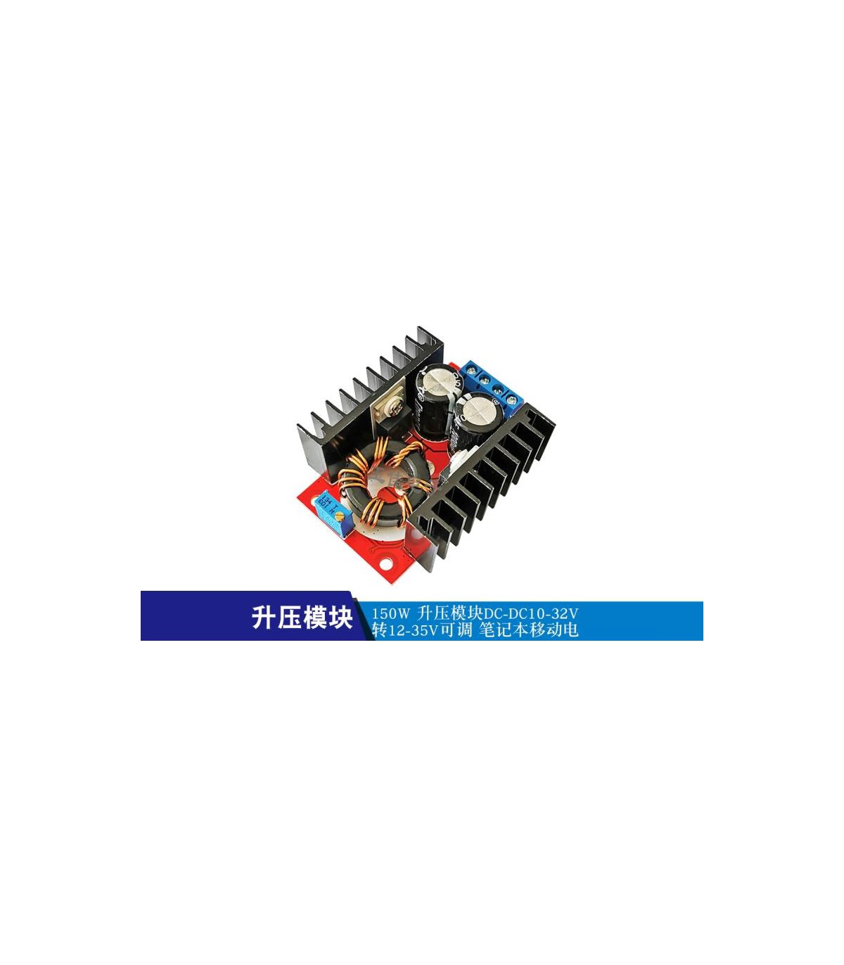Повышающий преобразователь модуль DC-DC 150W. Надежное исполнение, качественная пайка + применены высококачественные радиокомпоненты. Технические характеристикиТип модуля: неизолированный модуль повышенияРазмер модуля: длина 65 мм * высота 23 мм * (ширина 56,5 мм, включая радиатор)Режим ввода: вход + положительный вход, вход - отрицательныйРежим вывода: OUT + выход положительный, OUT- выход отрицательныйРежим подключения: без сварки, клеммныйВходное напряжение: 12-32 ВВыходное напряжение: (1) плавно регулируемое (12-35 В) (2) Фиксированный выход (любой выбор между 12-35 В)Выходной ток: 6А (макс.)Входной ток: 10 (макс.) (Увеличьте тепловыделение, если оно превышает 10 А)Выходная мощность: естественное охлаждение 100 Вт (макс.), Плюс можно добавить вентилятор 150 (макс.)Легко управляйте ноутбуком мощностью 65 Вт 90 Вт, включая двухъядерныйИспользуйте аккумулятор 12 В с обычным модулем ноутбука 19 В 3,42 А, температура около 45 градусовЭффективность преобразования: 94% (измерено при 16 В на входе и 19 В на выходе 2,5 А) (только для справки)Рабочая температура: промышленный уровень (от -40 ° C до + 85 ° C) (температура окружающей среды превышает 40 ° C, пожалуйста, уменьшите потребляемую мощность или добавьте вентилятор)Повышение температуры при полной нагрузке: 45 ℃Ток без нагрузки: обычно 25 мАЗащита от короткого замыкания: Нет (пожалуйста, установите на входе защиту от перегрузки по току)Защита входа от обратного подключения: нет, подключите диод последовательно со входомБез гальванической развязкиВес: 70 гДиапазон применения1) Сделайте своими руками выходной регулируемый автомобильный источник питания, вам нужно только подключить источник питания 12 В на входе, выходное напряжение можно регулировать свободно (14-35 В), но выходное напряжение не может быть ниже входного.2) Универсальный автомобильный блок питания ноутбука.