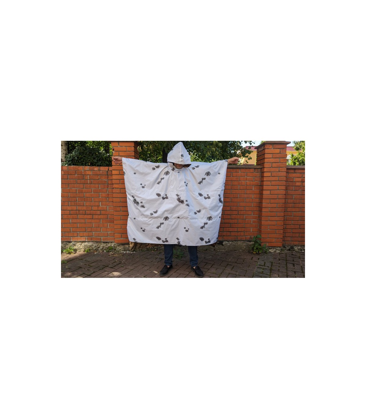 Особенности и технические характеристики Длина пончо: зад – 120см, перед – 98см, плечи – 141см (размеры взяты без капюшона в свернутом виде, пончо можно развернуть и использовать в качестве палатки) Стирать пончо нельзя, только чистить, складывать также не желательно, так как металлизированная ткань и может повредиться Пончо двухстороннее, пиксель с одной стороны, зимний камуфляж с другой стороны