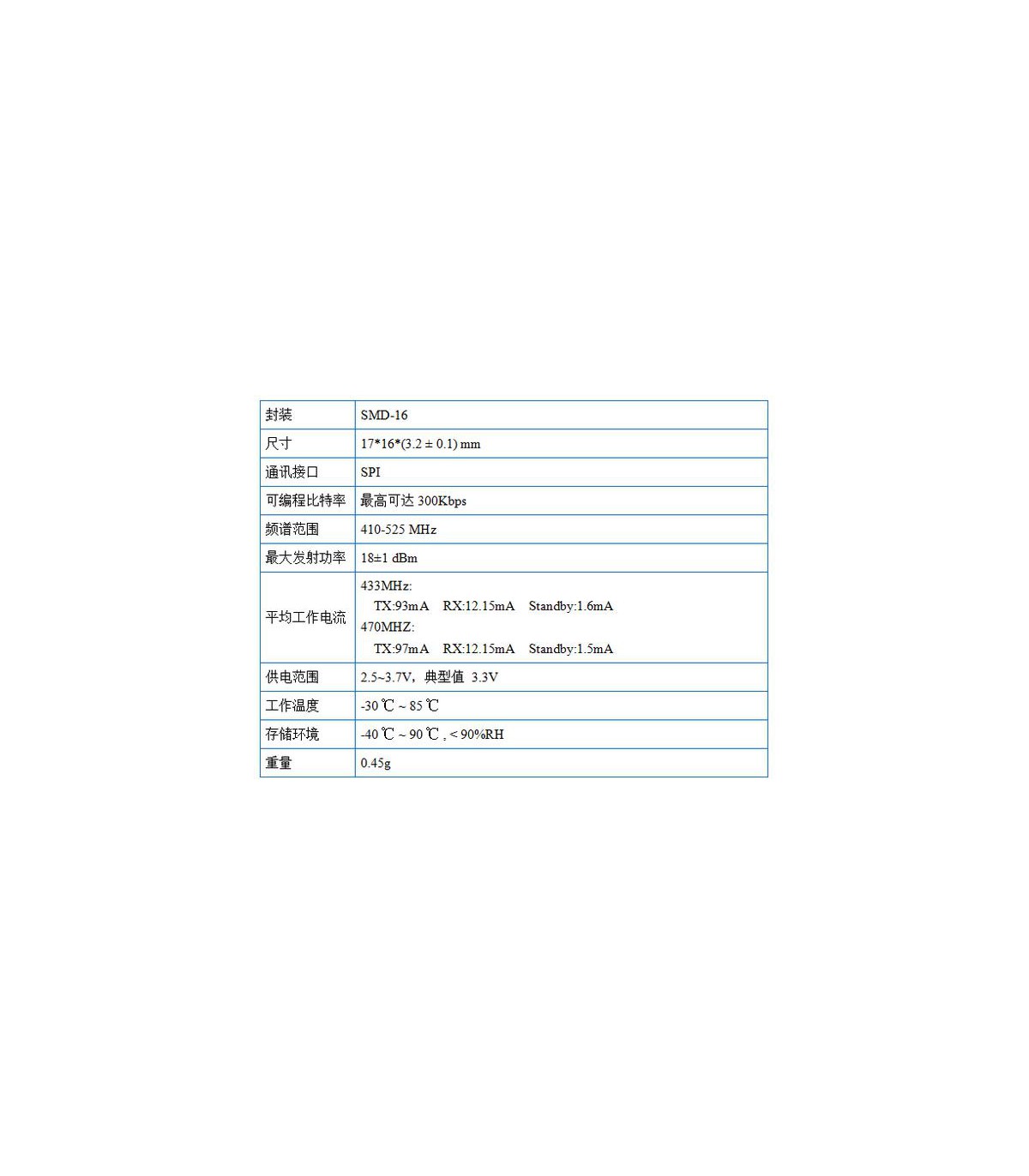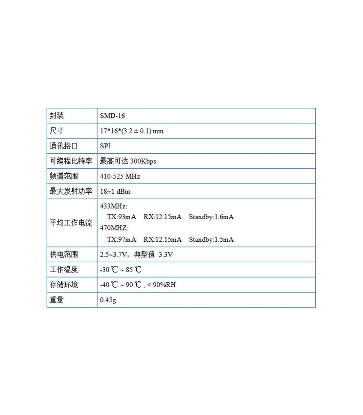 Технология модуляции спектра: LoRaTM Сверхдлинная связь: 15 км Постоянная выходная мощность РЧ с изменением напряжения: + 20dBm-100mW Высокая чувствительность: всего лишь -148 дБм Полудуплексная связь: SPI Программируемая скорость передачи: до 300 кбит/с Поддержка методов модуляции: FSK, GFSK, MSK, GMSK, LoRaTM и OOK Динамический диапазон: RSSI 127 дБ