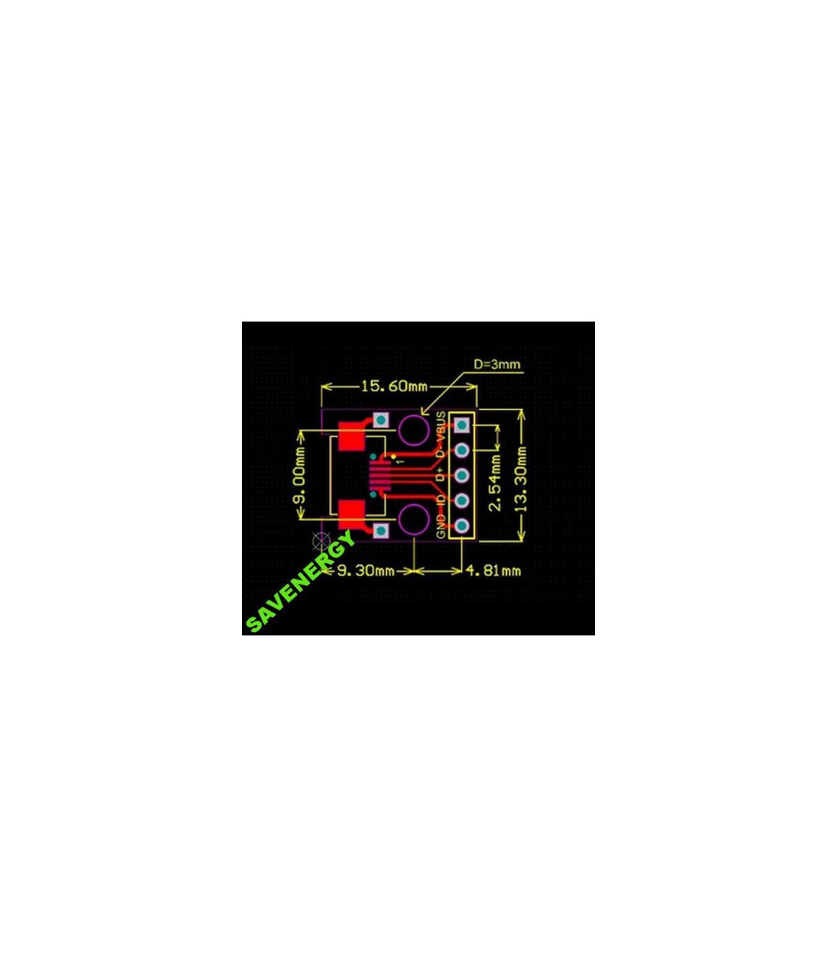 Модуль micro usb, легко превращается в обычный DIP 2.54mm контакт и можно использовать с макетными платами а также з другими електроными самоделками. Имеет два отверствия для крепления