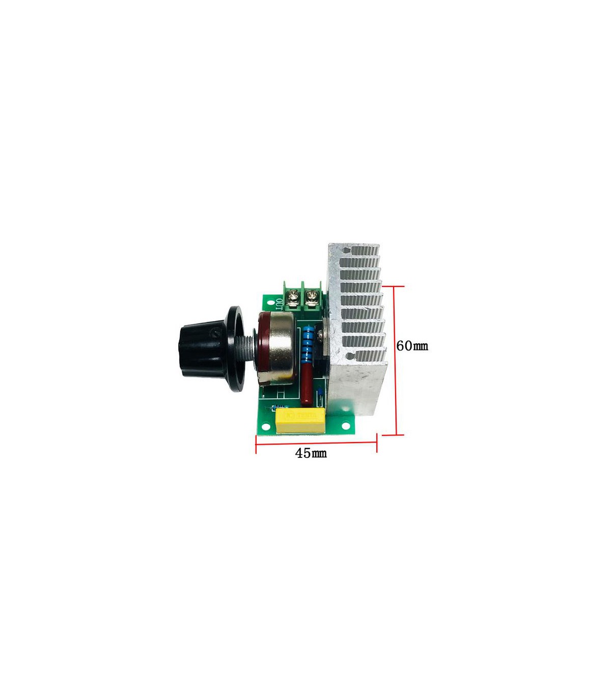 Мощный электронный симисторный регулятор напряжения переменного тока предназначен для регулировки мощности разных обогревательных и осветительных приборов, регулировки мощности паяльника, скорости вращения асинхронных моторов, температуры и так далее. У регулятора очень широкое применение в быту из-за его большой мощности (4000Вт) и широкого диапазона регулировки напряжения от (60В) до (220В). Технические характеристики Входящее напряжение: 220В Максимальная мощность: 4000Вт Максимальный выходной ток: 18А Диапазон регулировка напряжения: 60В - 220В Размер: 5.7см x 7.2см x 4см * схема подключения регулятора последовательная, то есть в разрыв одного провода