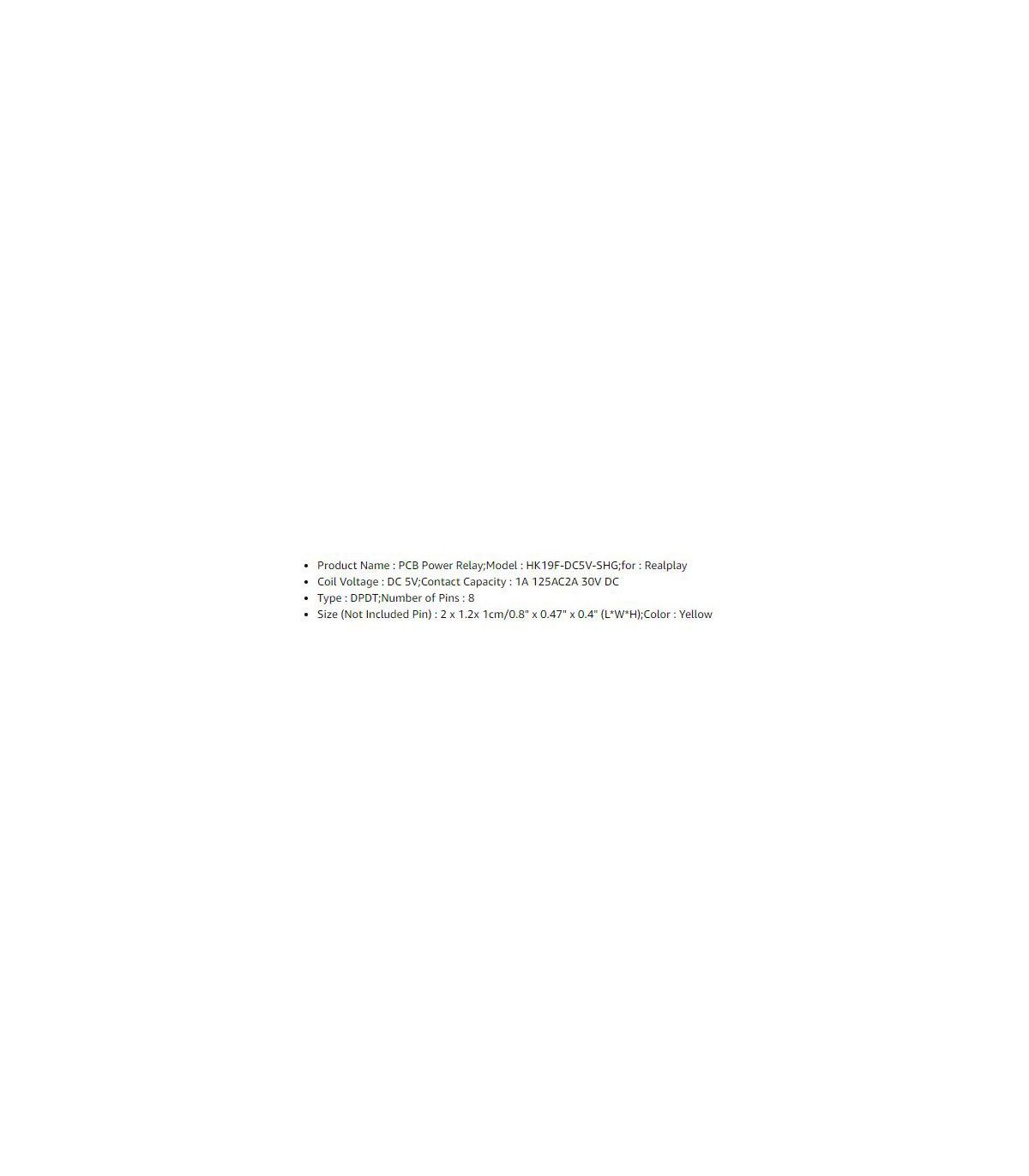 Реле HK19F-DC12V-SHG 12VDC Arduino PIC AVR. Технические характеристики Цвет: желтый Материал: пластик + медь Тип DIP-8-контактный 1A 125V AC 2A 30V DC Высокое переключения: 125VA / 60W Потребление Мощность катушки:...