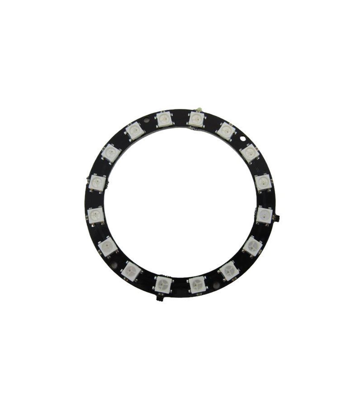 Светодиодный модуль RGB WS2812 5050 круг 16 диодов.Круглая плата с размещенными на ней 16-й RGB светодиодами WS2812, управляемыми по последовательной шине.Особенности:Встроенный интеллектуальный защита от обратной полярностиВстроенная микросхема управления RGB светодиодомУправления и светодиоды упакованы в стандартный корпус 5050Изменение цвета происходит только после полного завершения передачи данных, исключает мерцание и искажение цветаВстроенная схема сброса и сторожевая система исключает зависаниеПростой в использовании последовательный протокол передачи данныхПередача данных возможна на расстояние до 5 метров без применения дополнительных схем согласованияЯркие и насыщенные цвета, простое управление и умеренная ценаТехнические характеристики:Количество светодиодов: 16Напряжение питания: 4-7В постоянного токаСуммарный ток: 120 мАМодель светодиодов: WS2812 RGBИнтерфейс: однопроводной последовательныйцвет черныйВнешний диаметр: 66 ммВнутренний диаметр: 53 ммВес: 7 г
