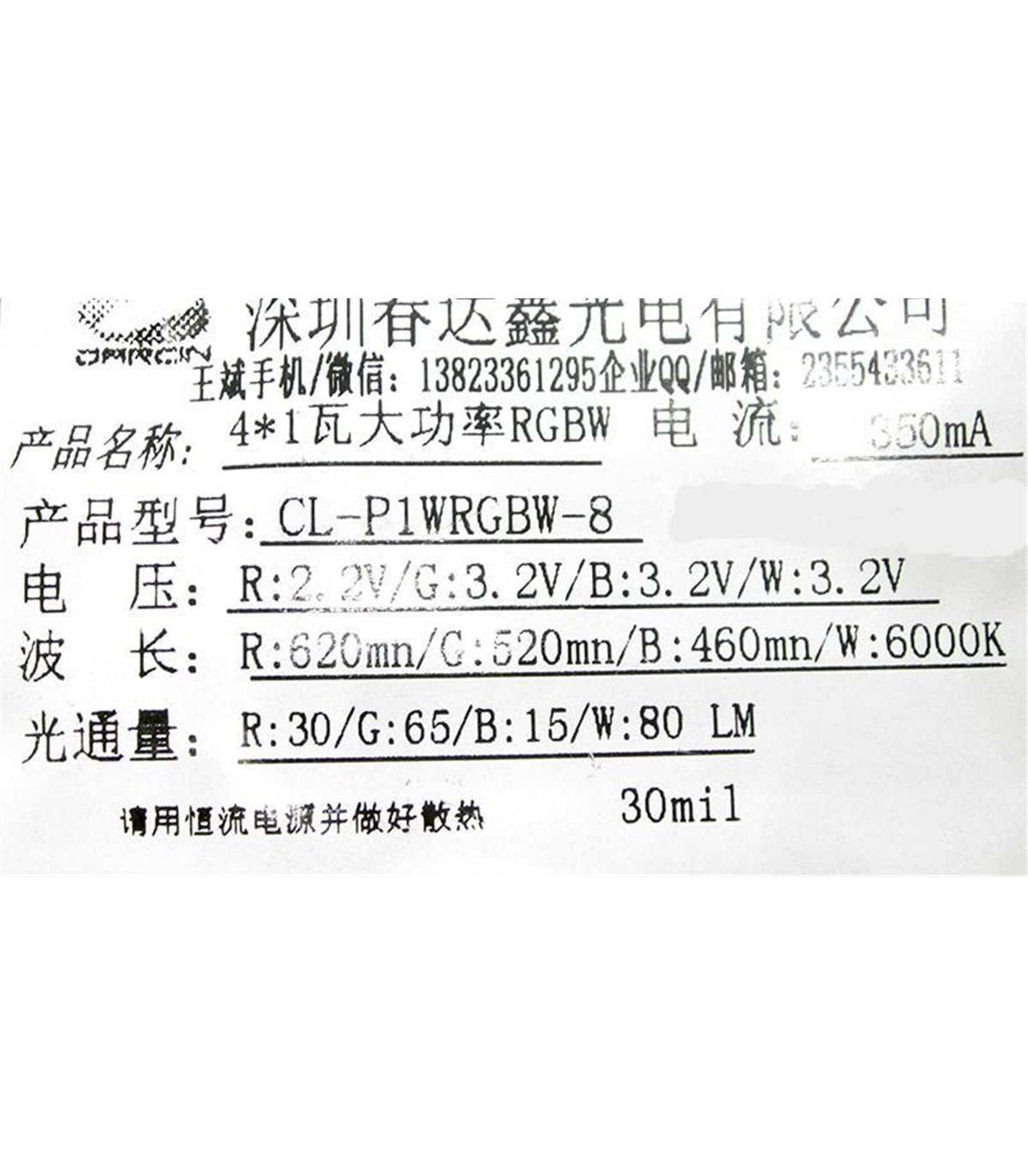 RGBW (сокр. от англ. Red Green Blue White — ‎красный зелёный синий белый) Технические характеристики Название: CL-P1WRGBW-8 Ток: 350 mA Мощность: 4х1W R:2.2V/G:3.2V/B:3.2V/W:3.2V R:620mn/G:520mn/B:460mn/W:6000K R:30/G:65/B:15/W:80 Lm 30 mil