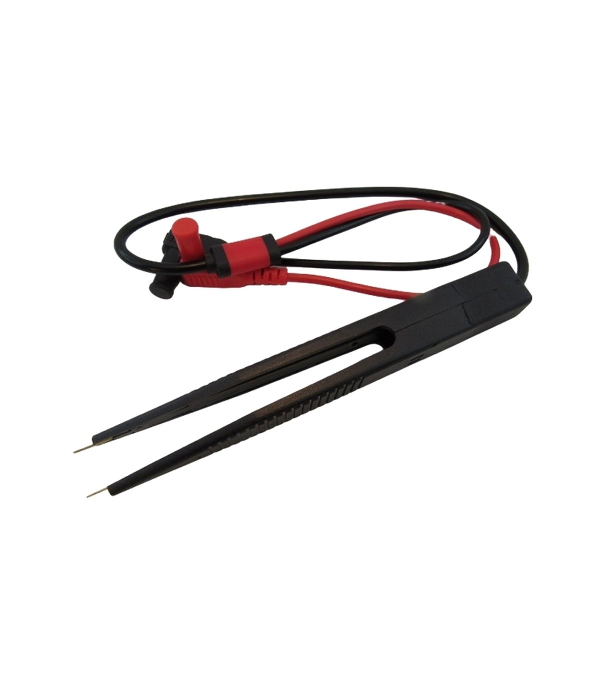 Данный щуп подойдет для тех, кому необходимо часто проверять на платах SMD элементы. Удобство заключается в том, что Вам не нужно держать в руках 2 щупа отдельно. Щуп выполнен в форме пластикового пинцета с металлическими токосъемниками для легкого доступа к контактам SMD элементов. На окончаниях пинцета есть обозначение '+' и '-' для соблюдения полярности. Кабель, соединяющий пинцет с мультиметром, достаточной длины (45 см) и имеет на конце разветвления на 2 кабеля с угловыми вилками, имеющих заглушки.