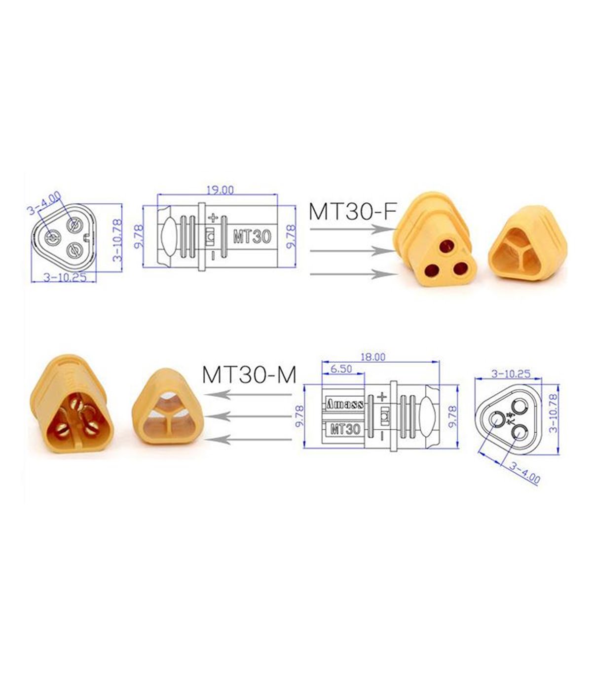 Комплект разъемов MT30 3 Pole для защиты ваших соединений двигателя и ESC. В комплекте разъемы папа и мама.
