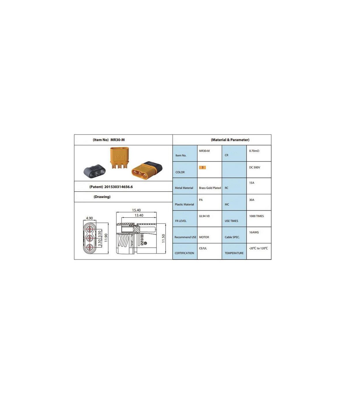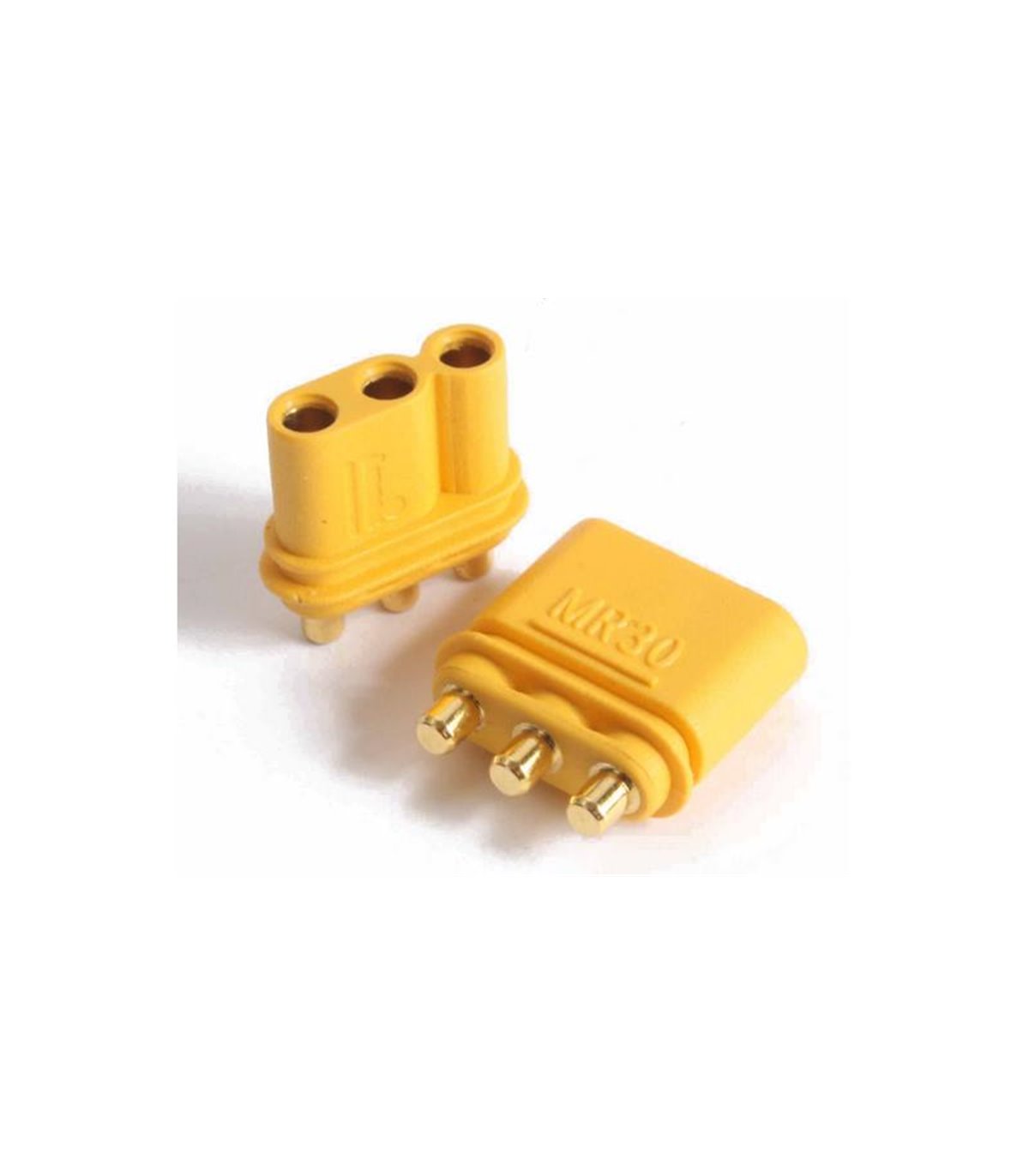 Штекер разъем нейлоновый MR30-m пара 30A.Спецификация:Наименование товара: разъем MR30Материал корпуса и покрытие поверхности: латунь и позолотаИзоляционный материал: PA66Оригинальное Внутреннее сопротивление: 0. 8MΩМаксимальный непрерывный ток: 30A (в пределах 30 мин.)Макс. мгновенный ток: 40А (в пределах 1 мини-группы)Рекомендуемый кабель спецификации: диаметр 18AWG 2,8 ммОсобенности:Подходит для подключения ESCs и двигателейС защитным ковпачком