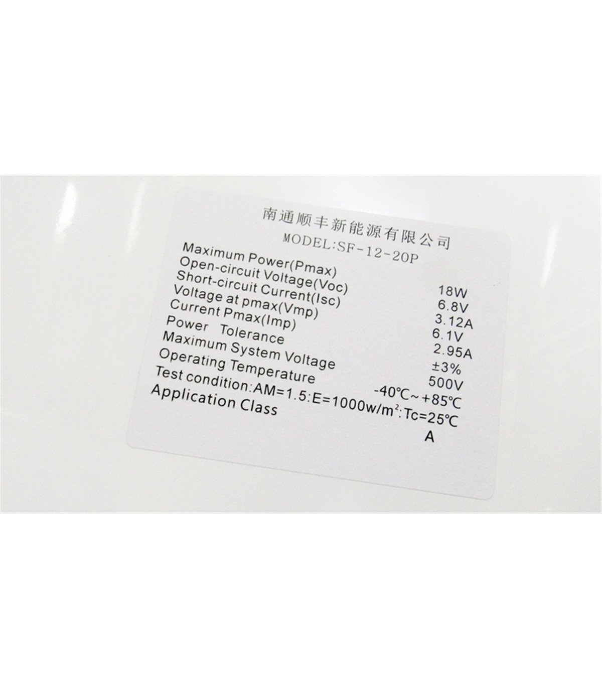 Технические характеристики Структура материала панели: монокристаллическая Угол установки: 30 - 55 ° (зависит от широты местности) Выходное напряжение: 6 В Максимальная мощность: 18 Вт Размеры: 400*340мм