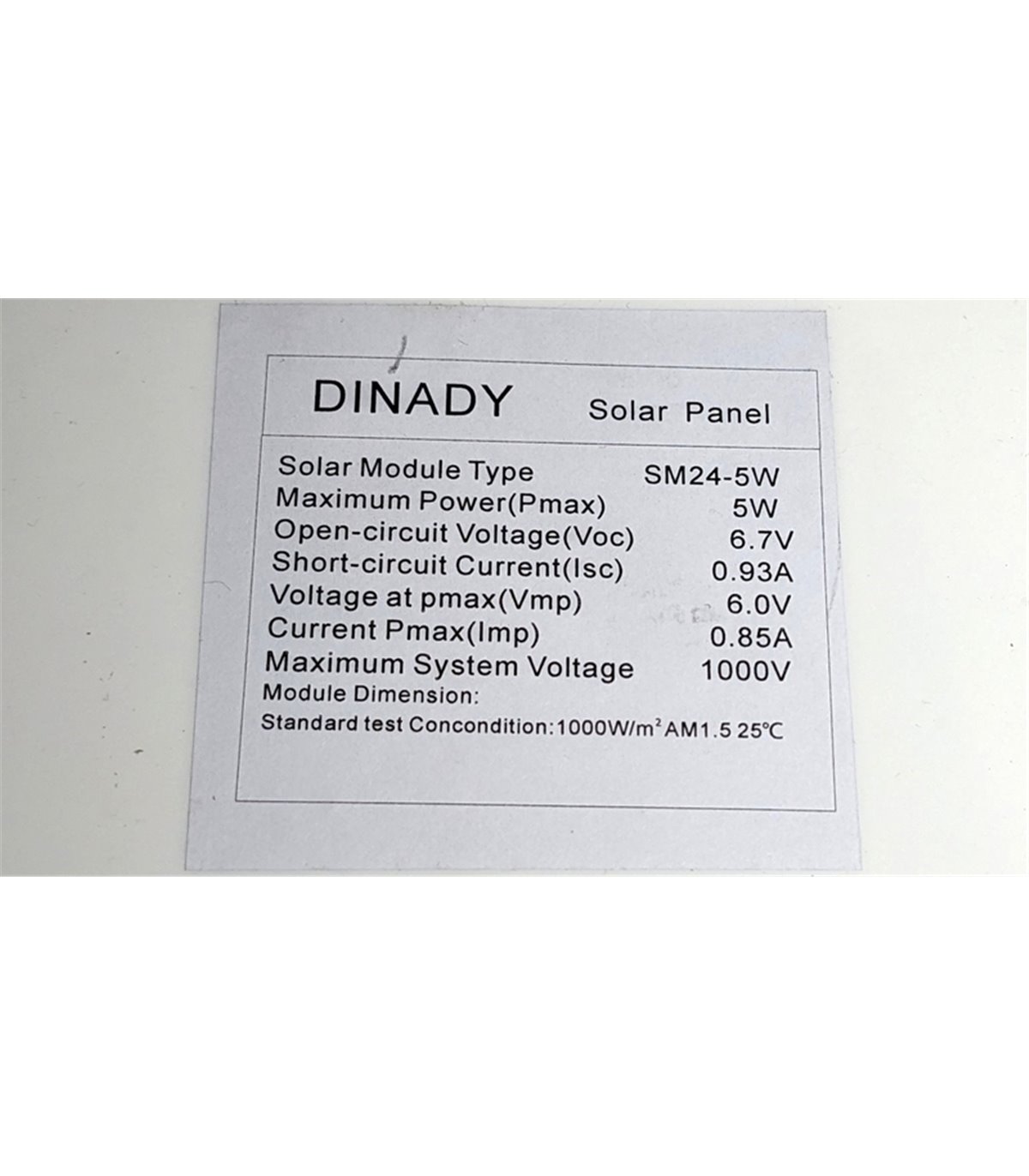 Технические характеристики Модель: SM24-5W Структура материала панели: монокристаллическая Угол установки: 30 – 55° (зависит от широты местности) Выходное напряжение: 6 В Максимальная мощность: 5 Вт Максимальное напряжение: 6.7 В Максимальный ток: 0.85 А Ток КЗ: 0.93 А Размеры: 300 х 190мм