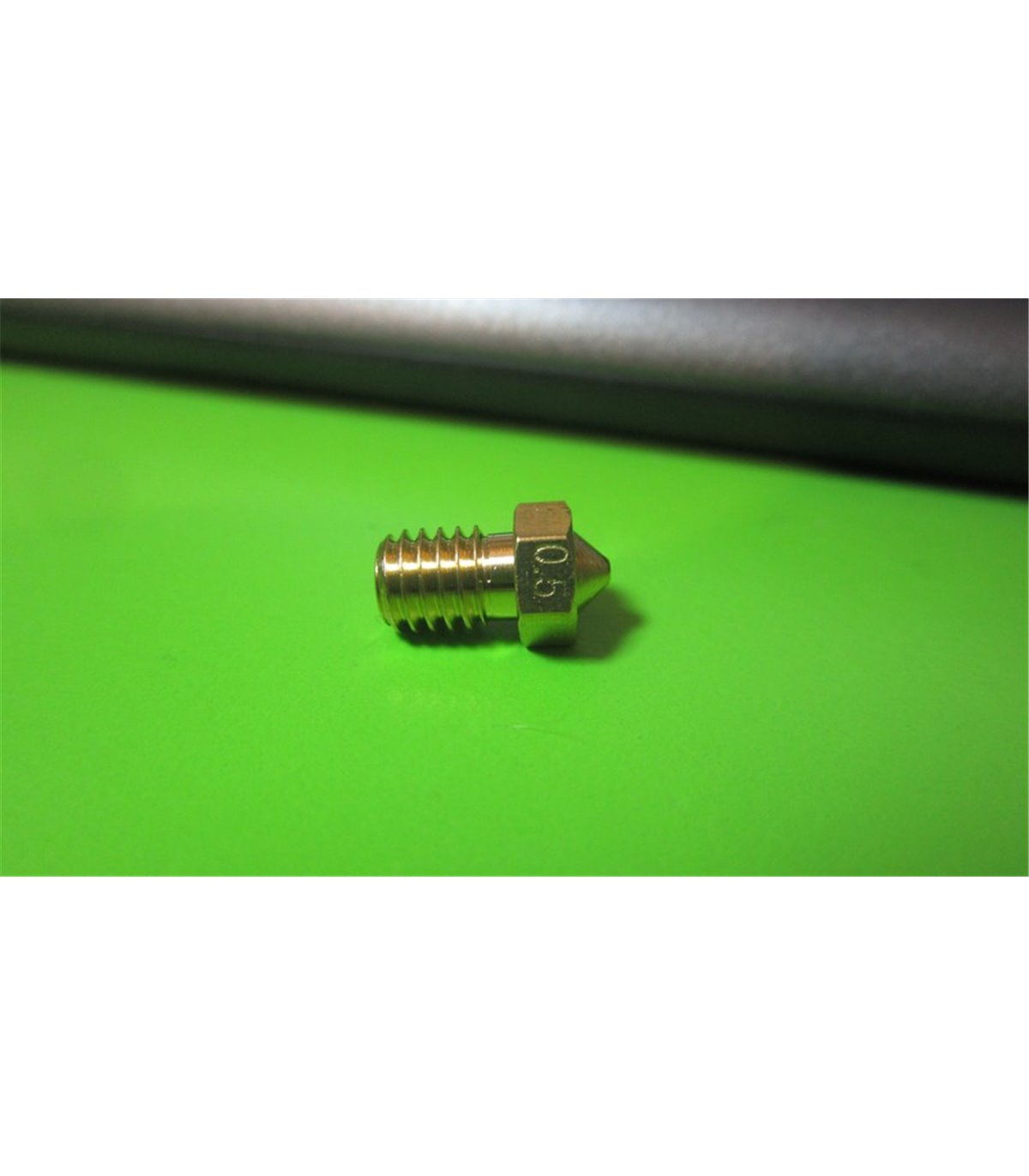 Сопло E3D 0.5мм под 3.0мм нить для 3D-принтера. Материал сопла – медный сплав. Конструкция проста – резьбовая часть и головка. В центральной части сопло оснащено входным отверстием, диаметр которого 3,0 мм. Возле вершины головки оно суживается до 0,5 мм. В основании конус выполнен в форме гайки. Благодаря этому её легко вкрутить в нагревательный блок. На резьбовой части резьба М6. Сопло совместимо практически со всеми классическими экструдерами, использующими филамент, диаметр которого 3.0 мм. Однако лучше всего применять его в работе с экструдерами E3D. После установки сопла существенно повышаются точность и качество печати, но при этом на печать тратится больше времени. Технические характеристики Сопло: E3D Размеры сопла (диаметр х высота): 0,7 х 1,25 см Входное отверстие диаметром: 3,0 мм Выходное отверстие диаметром: 0,5 мм Резьба для нагревательного блока: М6 Сопло весит: 2 г Материал сопла: медный сплав * цена указана за 1 штуку