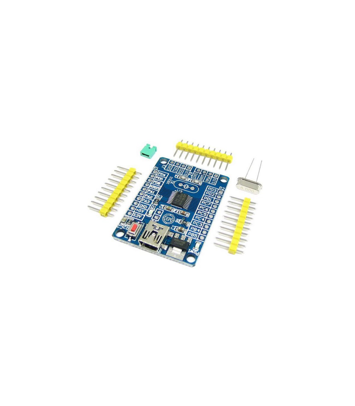 Миниатюрная плата для разработки на микроконтроллере STM8S003F3P6. Помимо микроконтроллера на плате имеются: разъем SMIM-интерфейса, кнопка для перезагрузки, контактные площадки для распайки выводов МК, стабилизатор 3.3 В, место для установки внешнего кварца и разъем Mini-USB, через который может осуществляться питание Одной из тенденций последнего времени стало уверенное упрочнение позиций фирмы ST на рынке 8-битных и 32-битных микроконтроллеров. Этому способствует поразительная дешевизна и в то же время отличная функциональность и богатый набор периферии этих микроконтроллеров.