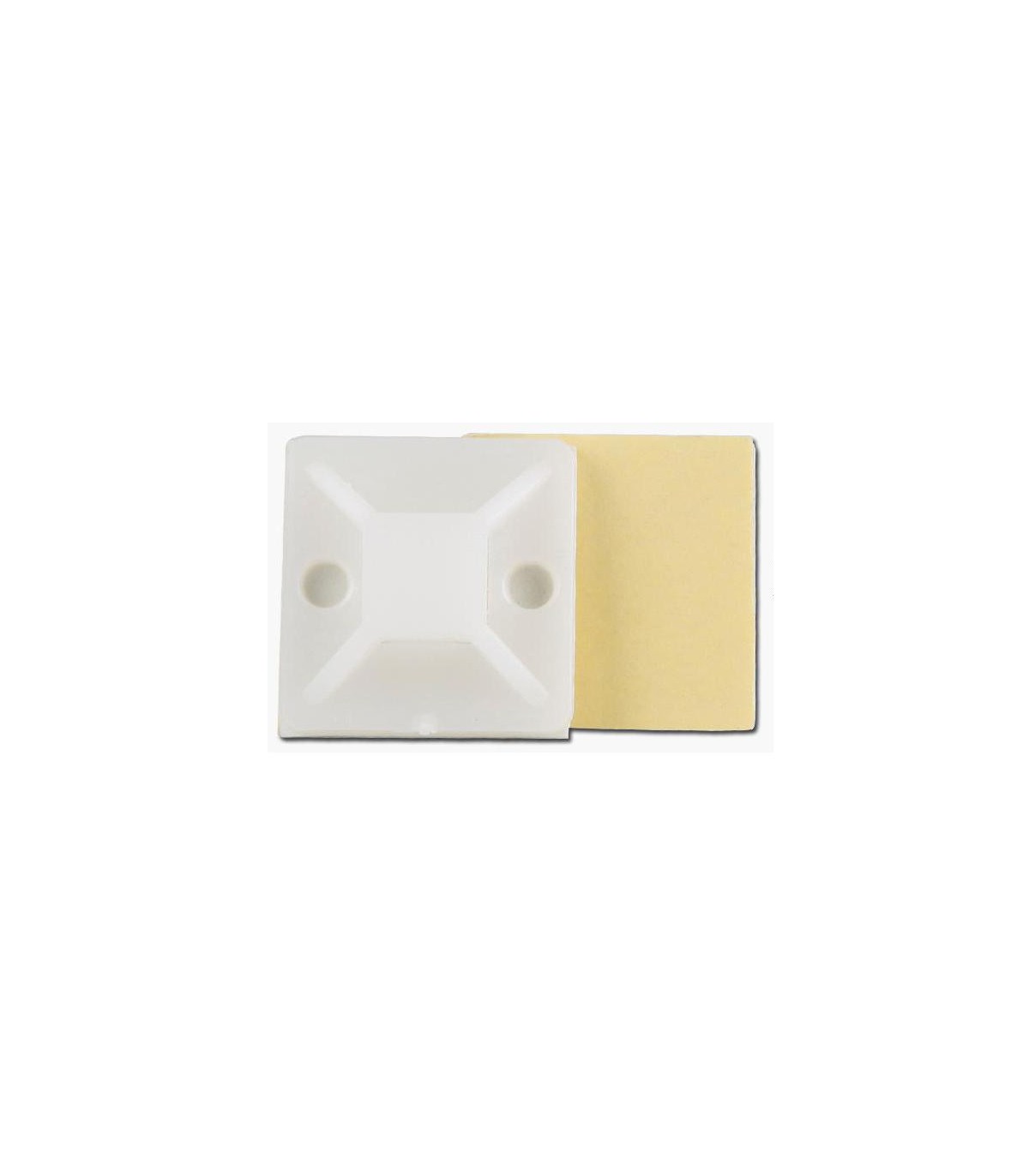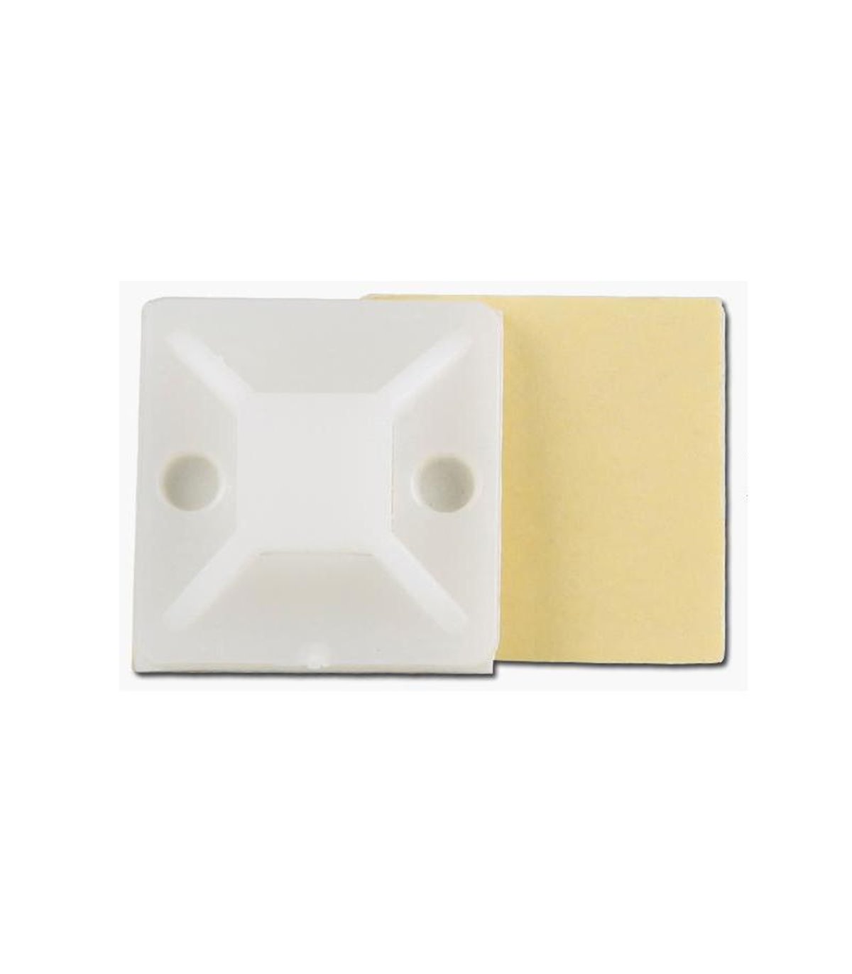 Площадка для крепления стяжек на липучке 25*25мм бежевая. Такие площадки обеспечивают быстрый и удобный монтаж без применения специальных инструментов и нарушения целостности поверхности. Клеевое основание обеспечивает надежное крепление. Материалом изготовления являестя полиамид 66 (нейлон), который отличается высокой прочностью, термостойкостью, устойчивостью к воздействию нефтепродуктов, смазочных материалов, огранических растворителей и т.д. и обладает хорошими электроизоляционными свойствами. В верхней части имеются специальные отверстия с четырех сторон для продевания стяжек. Площадки можно дополнительно зафиксировать с помощью саморезов или гвоздей.