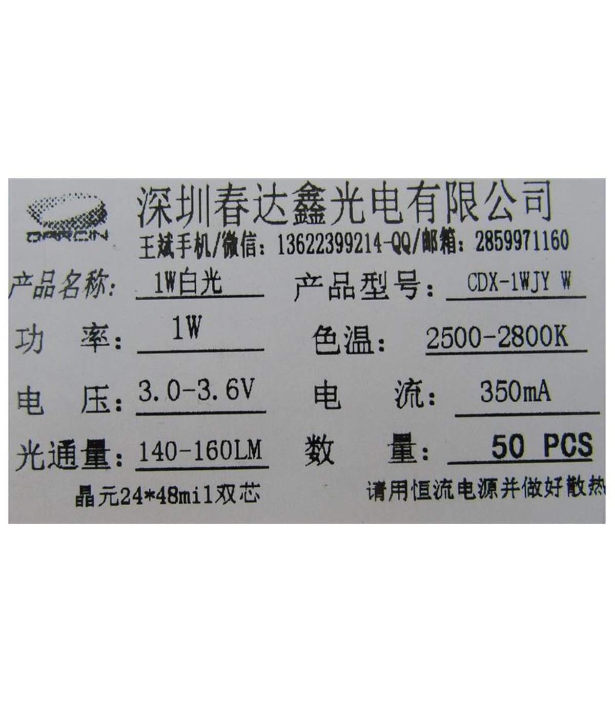 Технические характеристики: 1. Мощность: 1 Вт 2. Цвет: теплый 3. Ток: 350мА 4. Переднее напряжение: DC3.0-3.6V 5. Длина волны: 2500-2800K