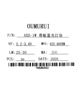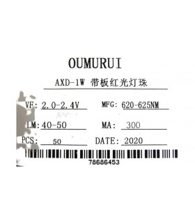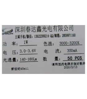 Технические характеристики: 1. Мощность: 1 Вт 2. Цвет: теплый 3. Ток: 350мА 4. Переднее напряжение: DC3.0-3.6V 5. Длина волны: 2800-3000K
