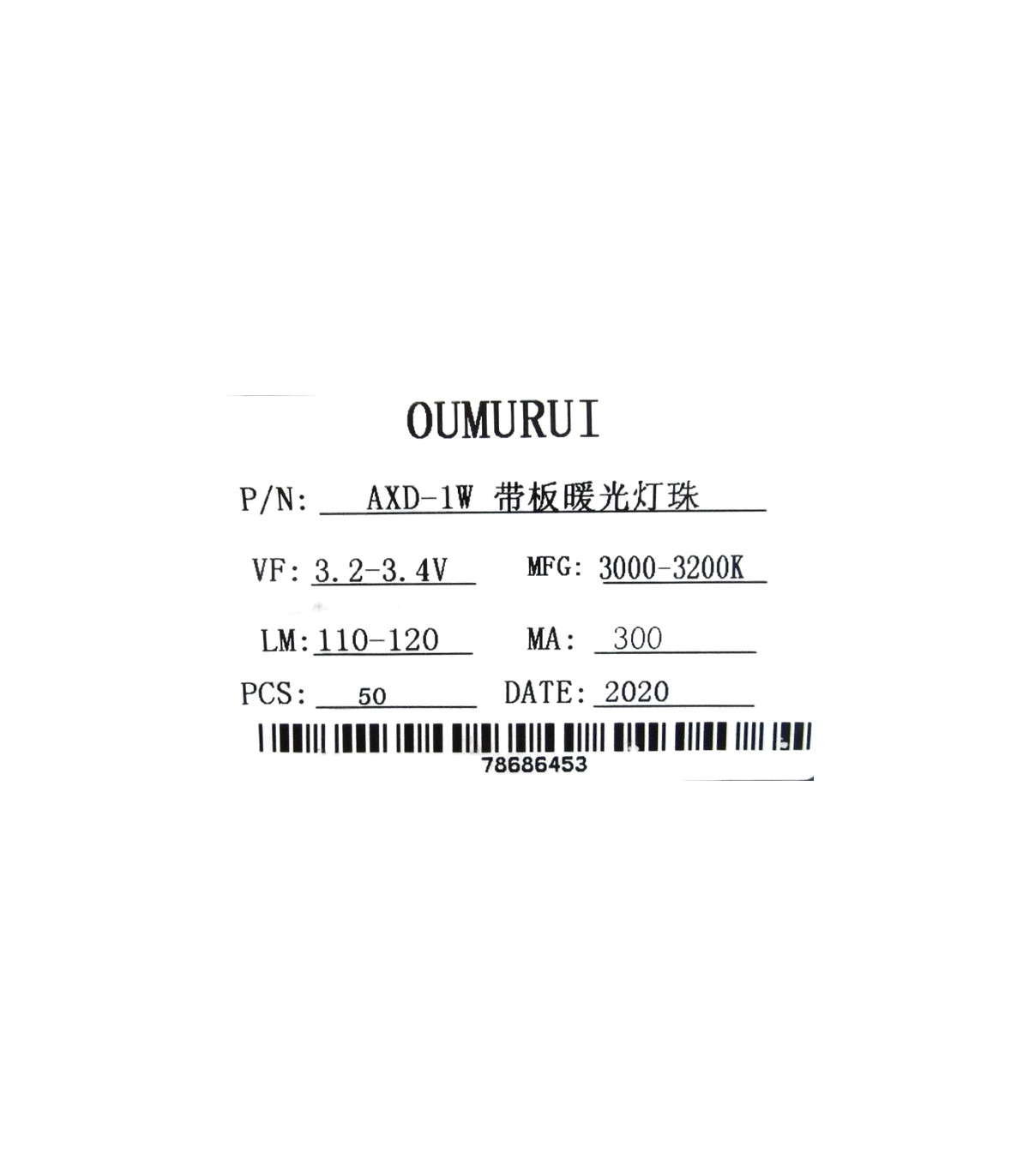 Технические характеристики: 1. Мощность: 1 Вт, 2. Цвет: теплый, 3. Ток: 300 мА, 4. Переднее напряжение: DC3.2-3.4V, 5. Длина волны: 3000-3200K.