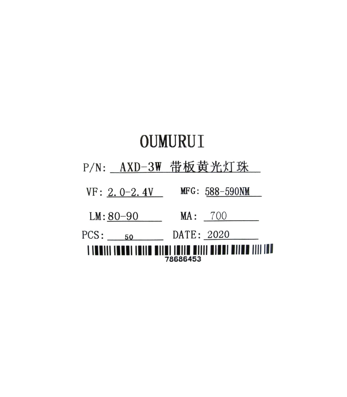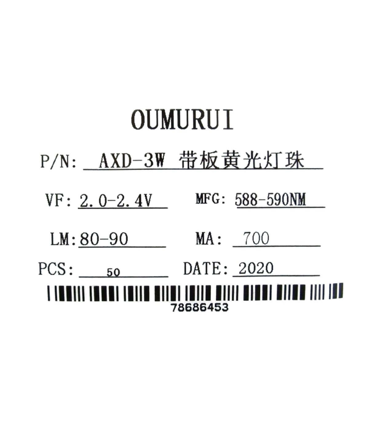 Технические характеристики: 1. Мощность: 3 Вт, 2. Цвет: желтый, 3. Ток: 600-700 мА 4. Переднее напряжение: DC2.0-2.4V, 5. Длина волны: 588-590nm.