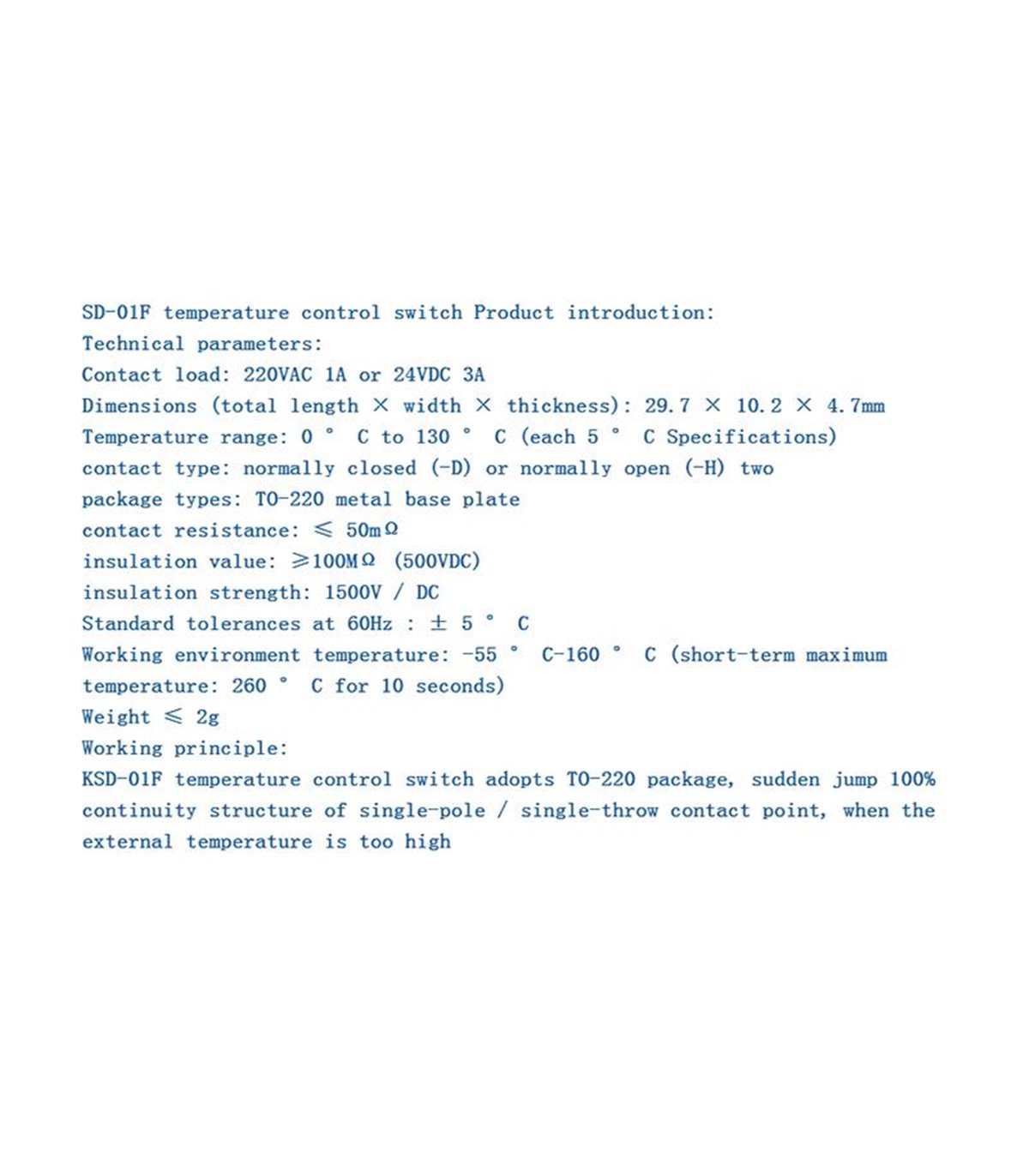 Технические характеристики Марка: KSD-01F JUC60°C Тип: D Температура срабатывания: 60° C Максимальный ток 220V AC: 1A Максимальный ток 24V DC: 3A Максимальное напряжение: 250V Тип корпуса: TO-220